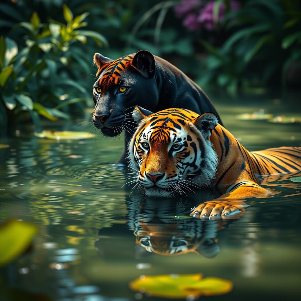 This image showcases two majestic animals, a black panther and a Bengal tiger, swimming together in a serene pond surrounded by lush greenery. The artwork features vibrant colors, intricate textures, and dynamic lighting, reminiscent of fantasy realism and digital painting.