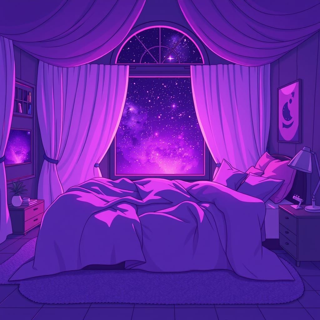This image depicts a magical bedroom at night, dominated by shades of purple and featuring a giant bed covered in blankets. The background shows a deep purple spatial scene.
