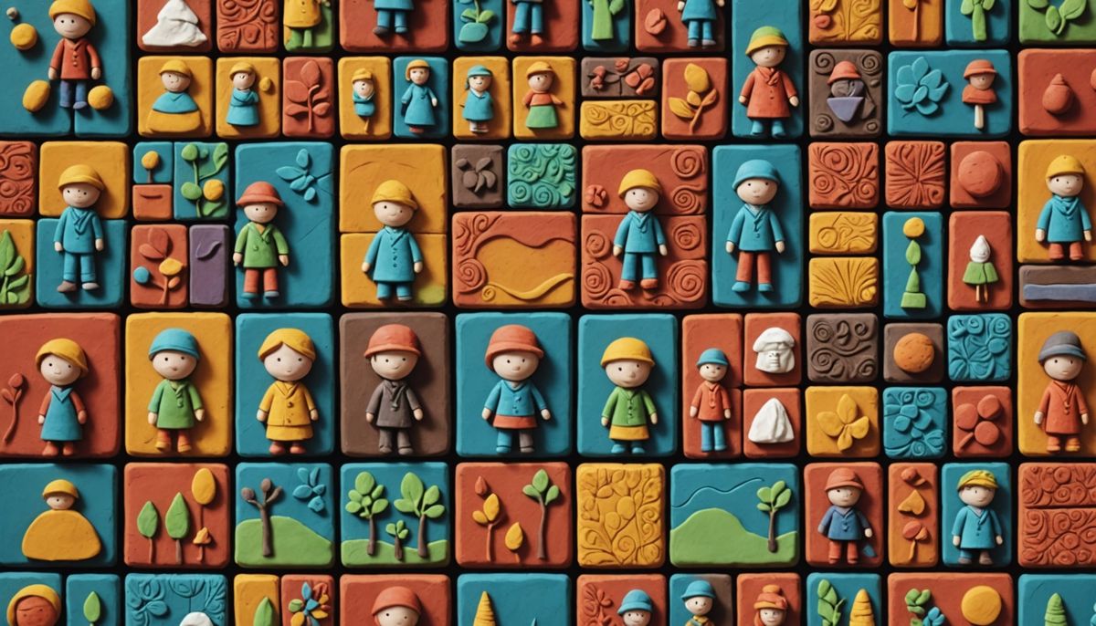 Clay Day: multipaneled image featuring mini figurines, textured tiles, soft landscapes, unique masks using soft clay and playdough. a breathtaking polyptych soft clay and playdough masterpiece, rich hues, gradual dark tones, cold to warm colors, unique color palettes, intricate textures, James McCarthy, Kentaro Miura, Luis Royo, mystical, misty, vaporwave.