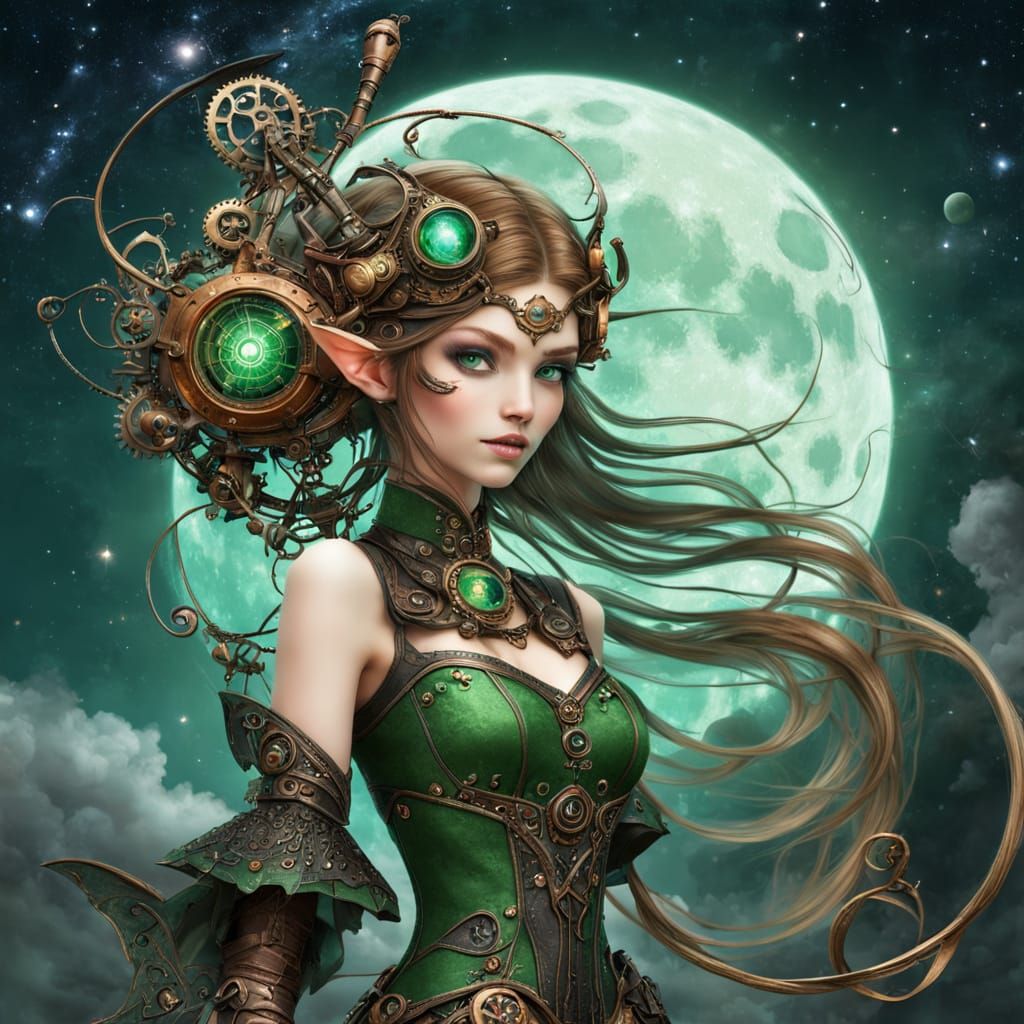 This image shows a beautiful fairy elf in a stunning haute couture dress, surrounded by a magical steampunk atmosphere and stardust, with a hint of celestial wonder.