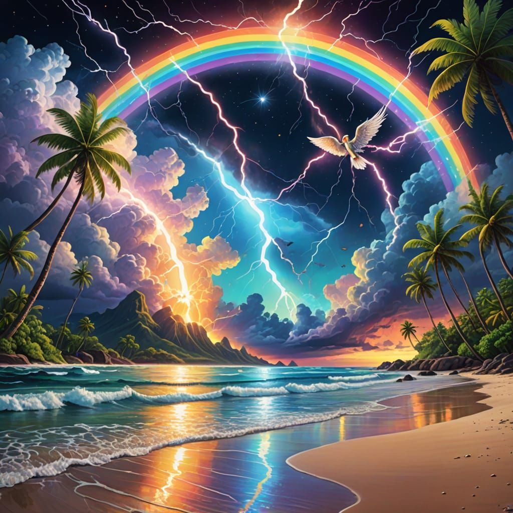 This vibrant image showcases a celestial gathering on a tropical beach, where radiant angels and majestic rainbows converge amidst electrifying lightning bolts, all set against a backdrop of cosmic wonder.