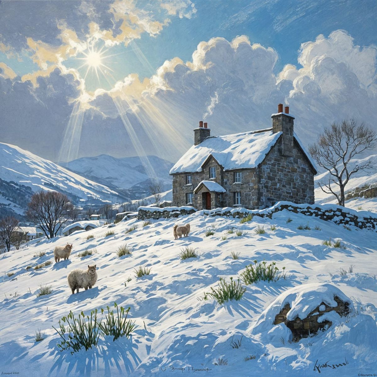 This impressionist style painting depicts a charming stone cottage on a snowy Snowdonia hill. Sunbeams break through clouds, illuminating sheep and snowdrops in the foreground.