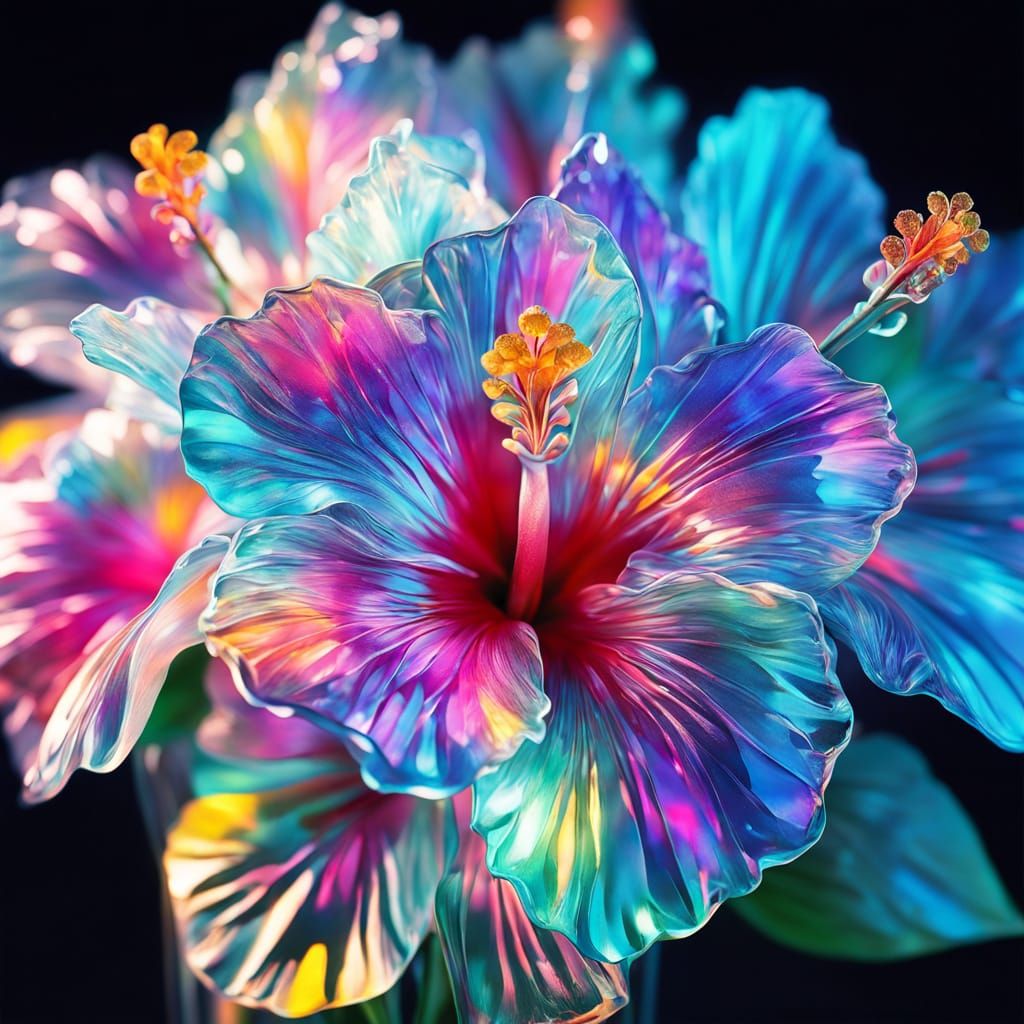 This image showcases a hyperrealistic bouquet of translucent, crystal hibiscus flowers in vibrant, dreamlike color gradients. Cinematic lighting highlights their intricate petals and subtle luminescence.
