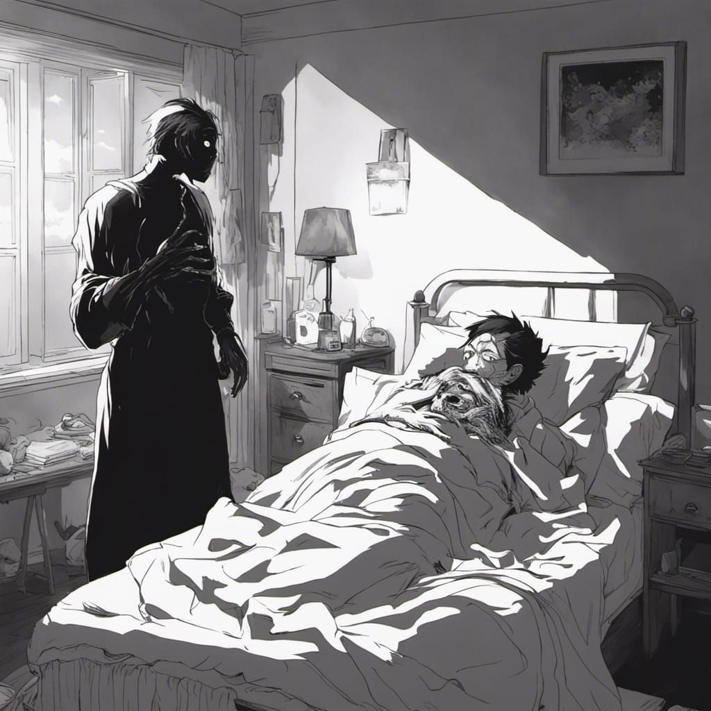 A gothic black and white image showing a man in traditional Malay headwear in bed with a strange creature. The artwork has a vintage horror aesthetic with natural lighting.