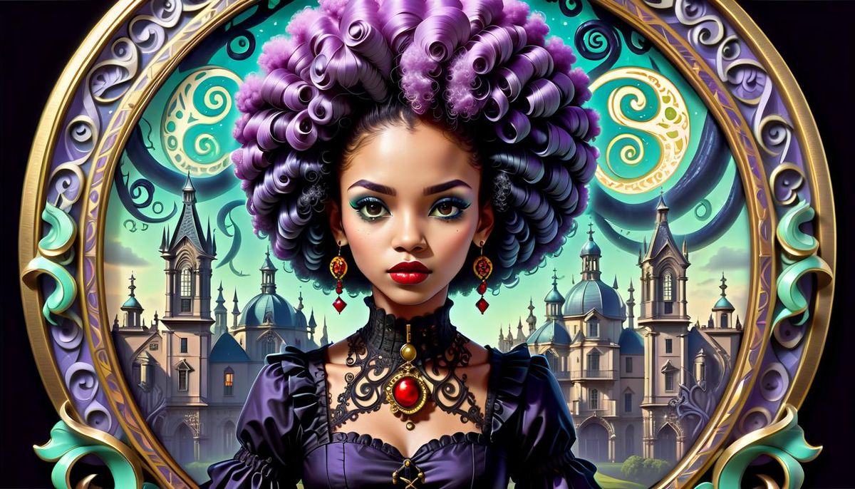 A portrait of a gothic Afro Latina woman in a baroque pin-up style. The image features stunning gothic pastel colors and intricate details, with a touch of eldritch horror.