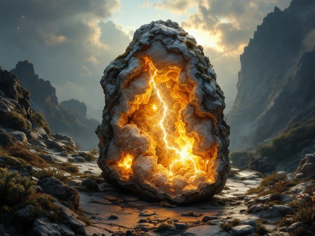 Generate unique semi-abstract art featuring crystal formations and tiny cottages. It's free and easy!