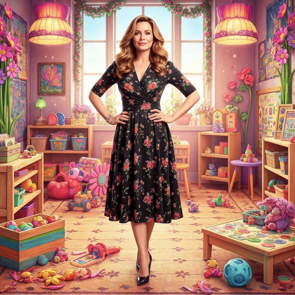 A digital rendering of Kathy Najimy as a teacher in a fairy-themed classroom. The classroom is inspired by Pixie Hollow with vibrant floral decorations, toys, and games. The artwork blends Artgerm's artistry and Mucha's elegance.