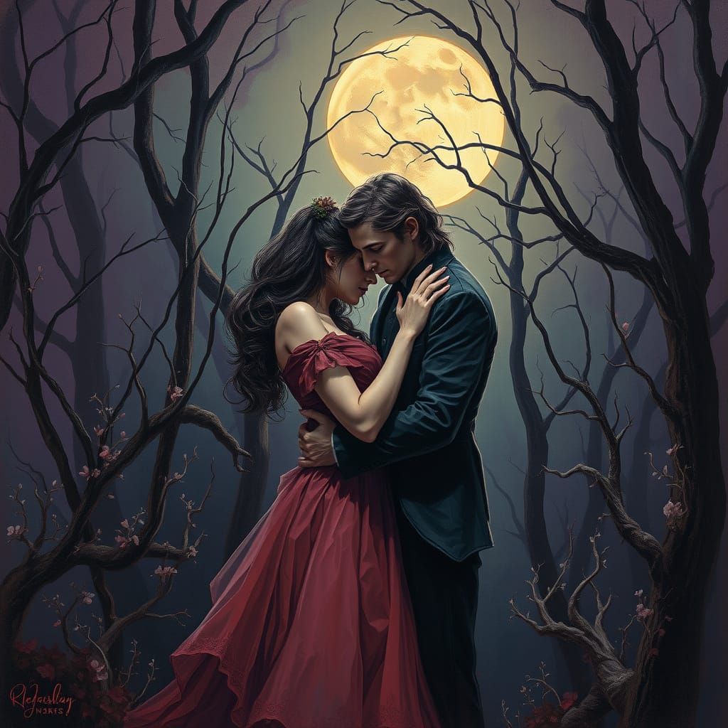 Liminal, gothic oil painting on a rich, textured canvas, depicts a melancholic lovers' entwined embrace amidst a haunting, moonlit forest, with skeletal trees looming like bony fingers, shrouding the pair in eerie shadows. Aesthetically, the piece embodies dark romanticism, with bold brushstrokes and ...