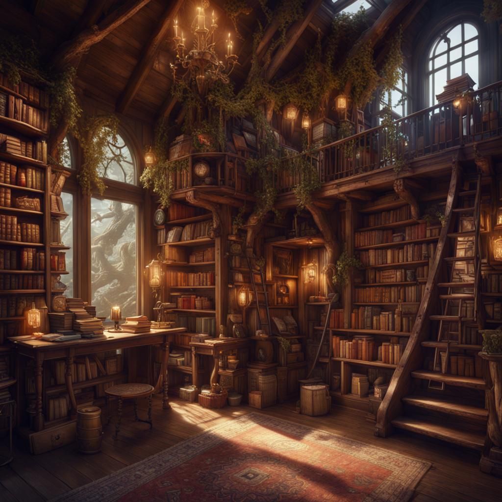 A detailed matte painting depicts an antique bookstore nestled within a treehouse. The fantastical scene features deep colors, intricate details, and complementary color schemes.