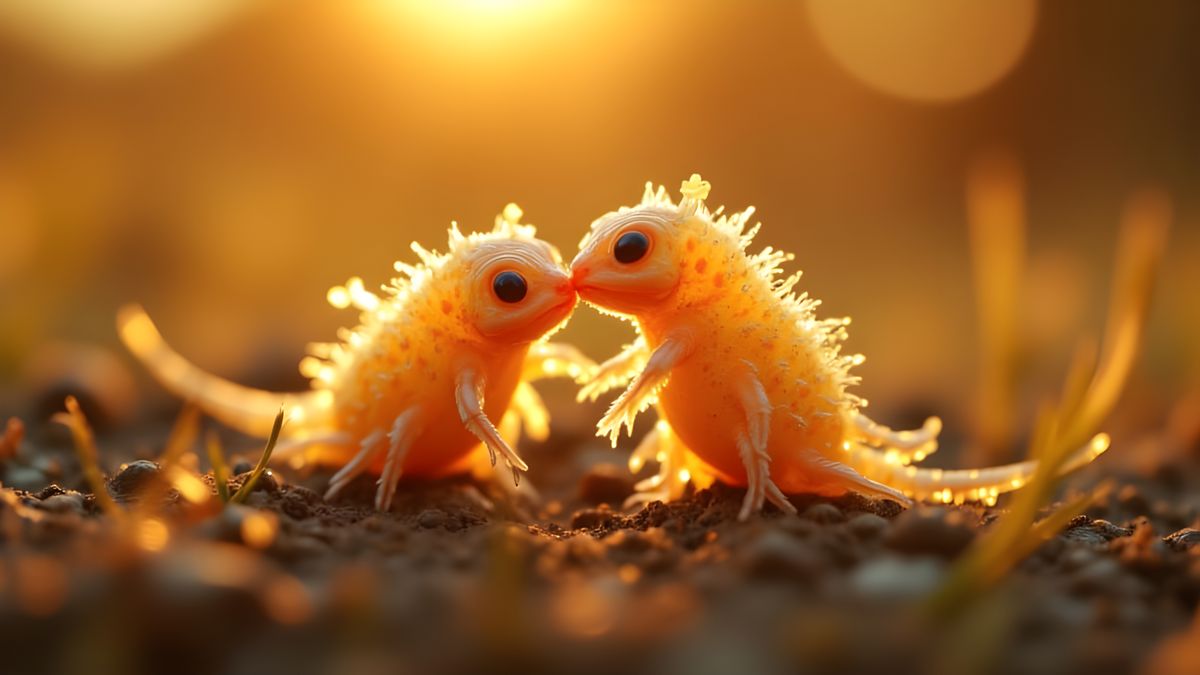 Convergence reflects the moment when two separate existences briefly dissolve their boundaries. In the golden light—symbol of impermanence and grace—the kiss becomes a quiet affirmation that connection is not about sameness, but about mutual recognition. Even at the smallest scale of life, intimacy emerges as a fundamental force: a reminder that meaning is often created not through survival alone, but through shared presence in fleeting time.