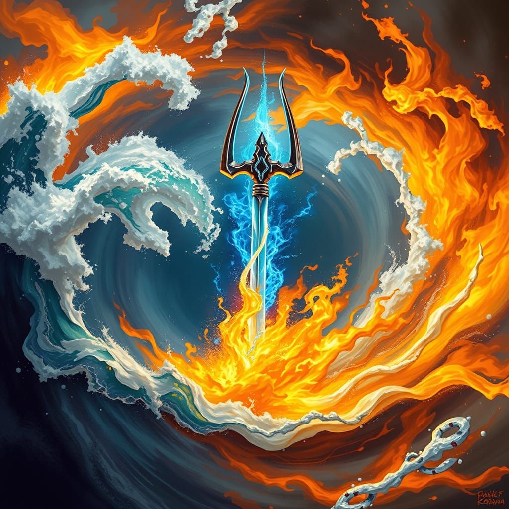 A digital painting depicting a dynamic battle between water and fire elements, featuring a trident and sword. Vivid blues and oranges dominate the scene, with dramatic lighting.