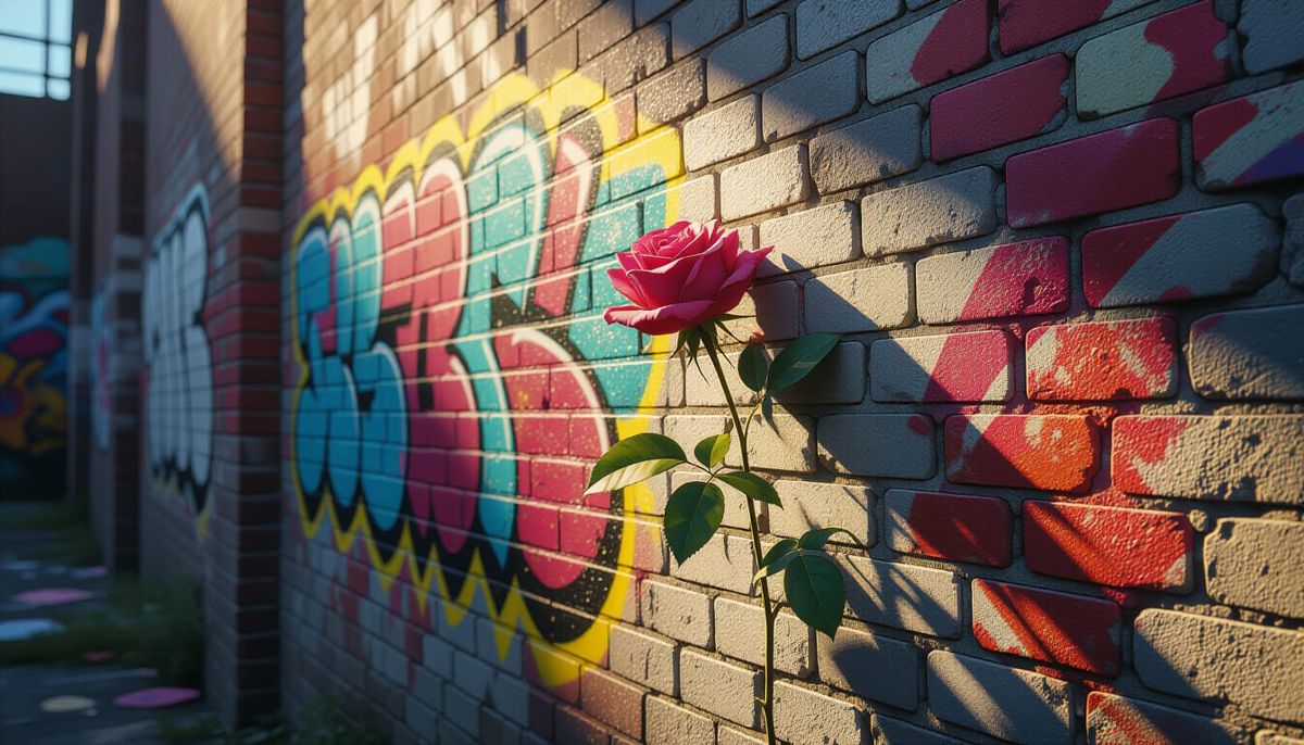 This image depicts a lone, tattered rose growing on a decaying brick wall in a gritty urban alley. Dramatic lighting emphasizes the rose against a background of chaotic spray paint, creating a street art masterpiece.