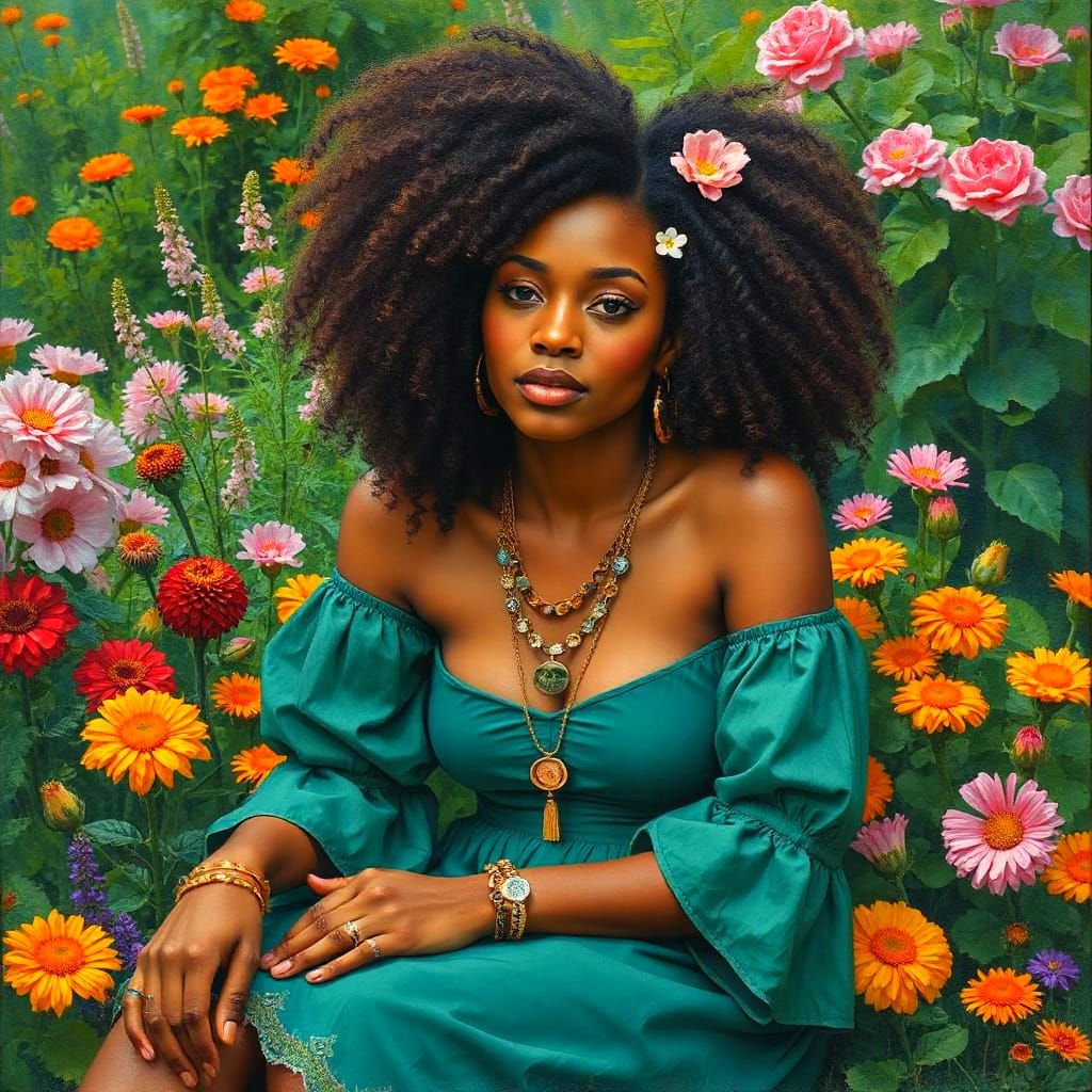 This image shows a serene African American woman surrounded by blooming flowers, wearing a stunning emerald green boho dress and eclectic jewelry, in a modern portrait style blending bold brushstrokes and vibrant colors
