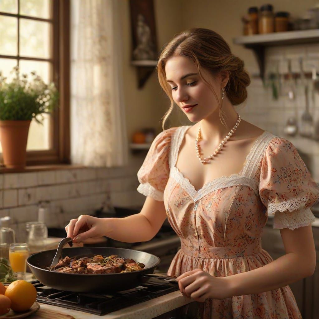 This image shows a smiling young woman cooking steak in a retro kitchen. The artwork features vibrant colors, soft focus, and intricate details, with the subject adorned in floral patterns and pearl jewelry.