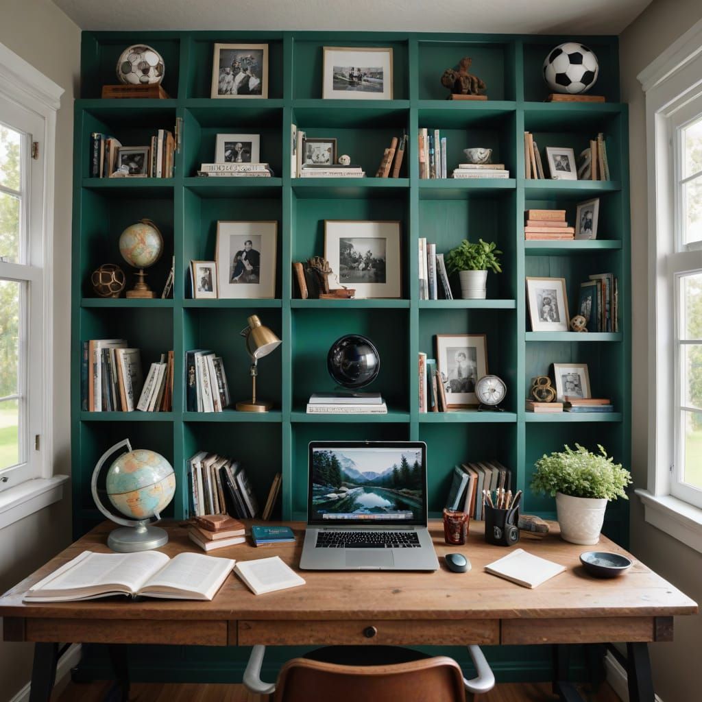 This image shows a country-style workspace in a luxurious villa, bathed in warm natural light. The interior features a rustic desk, soft focus jade green shelves, and sports decor in a serene atmosphere.