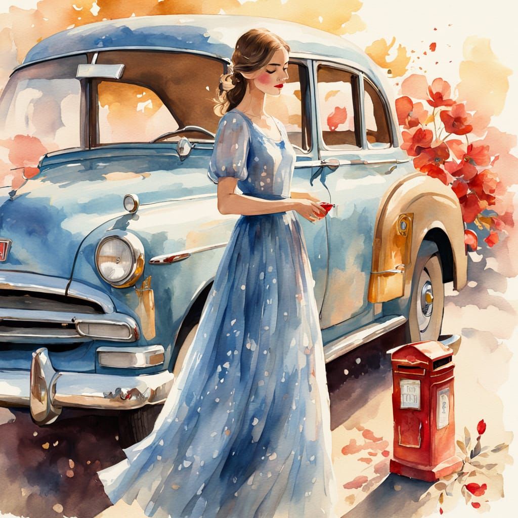 This charming watercolor painting captures a vintage moment in London, with a beautiful woman in a petal blue dress standing beside a classic car and red letter box, bathed in warm golden light and soft focus.