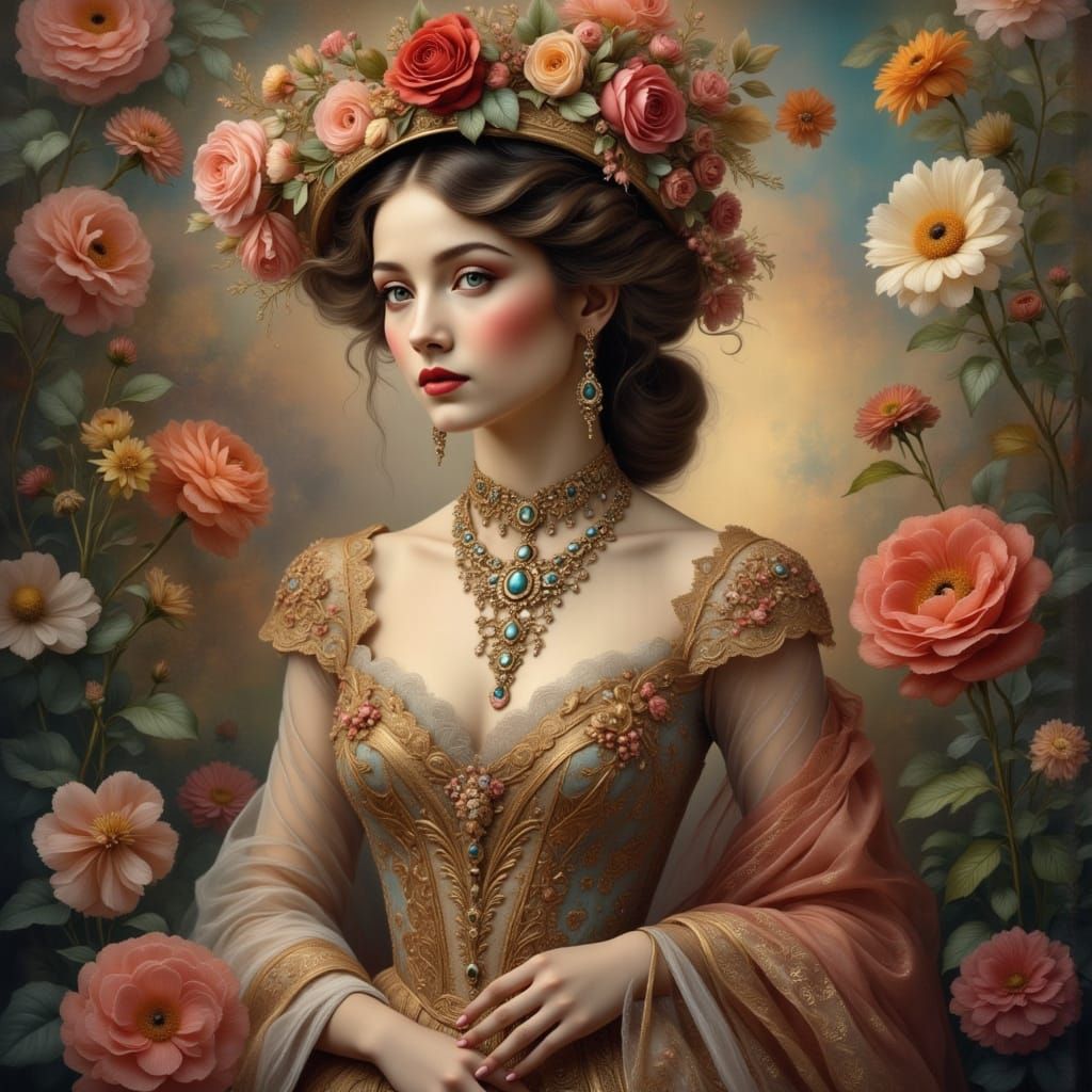 This image shows an elegant woman in Belle Epoque attire, complete with gemstone jewelry, set against a vibrant triangular background. Volumetric lighting and intricate textures create a splash art style.