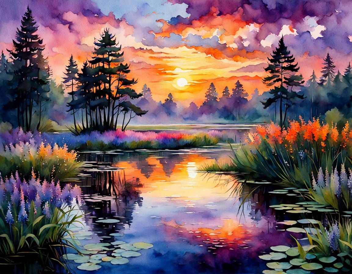 This image shows a stunning watercolor landscape of tall purple cornflowers in a serene glade, set against a warm orange sunset and purple clouds. The scene is completed by the silhouette of a heron in a peaceful pond, creating a sense of tranquility and natural beauty.