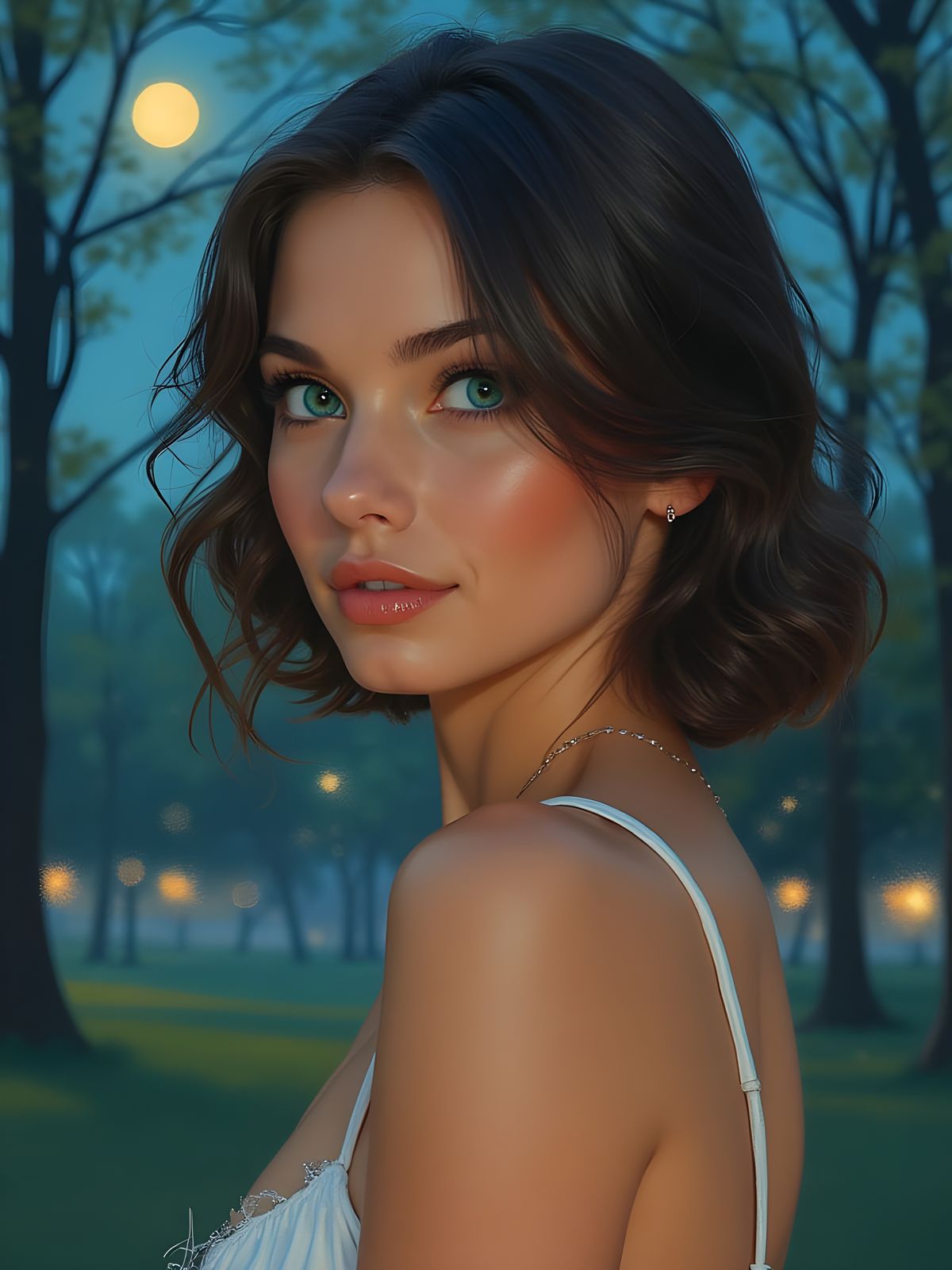 A watercolor pinup illustration of a woman with turquoise eyes. The close-up view features a detailed face and perfect anatomy, set in a park at twilight with a bokeh background.