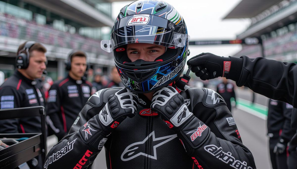 This image shows a close-up of a racer's hands adjusting their helmet during a pit stop. The scene conveys high tension with cinematic detail, focusing on the rider's wrinkled leathers and visible sweat.