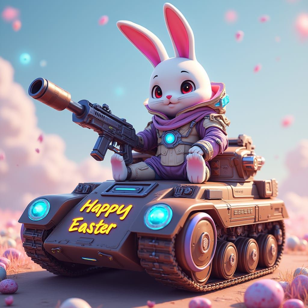 This vibrant, 3D anime art image features a futuristic Easter bunny in a sleek exosuit, sitting atop a gleaming chocolate tank, surrounded by swirling lights and Easter-themed decals. The bunny holds a high-tech gun with a confident expression, wearing a utility belt with pouches and gadgets, in a bold, ...