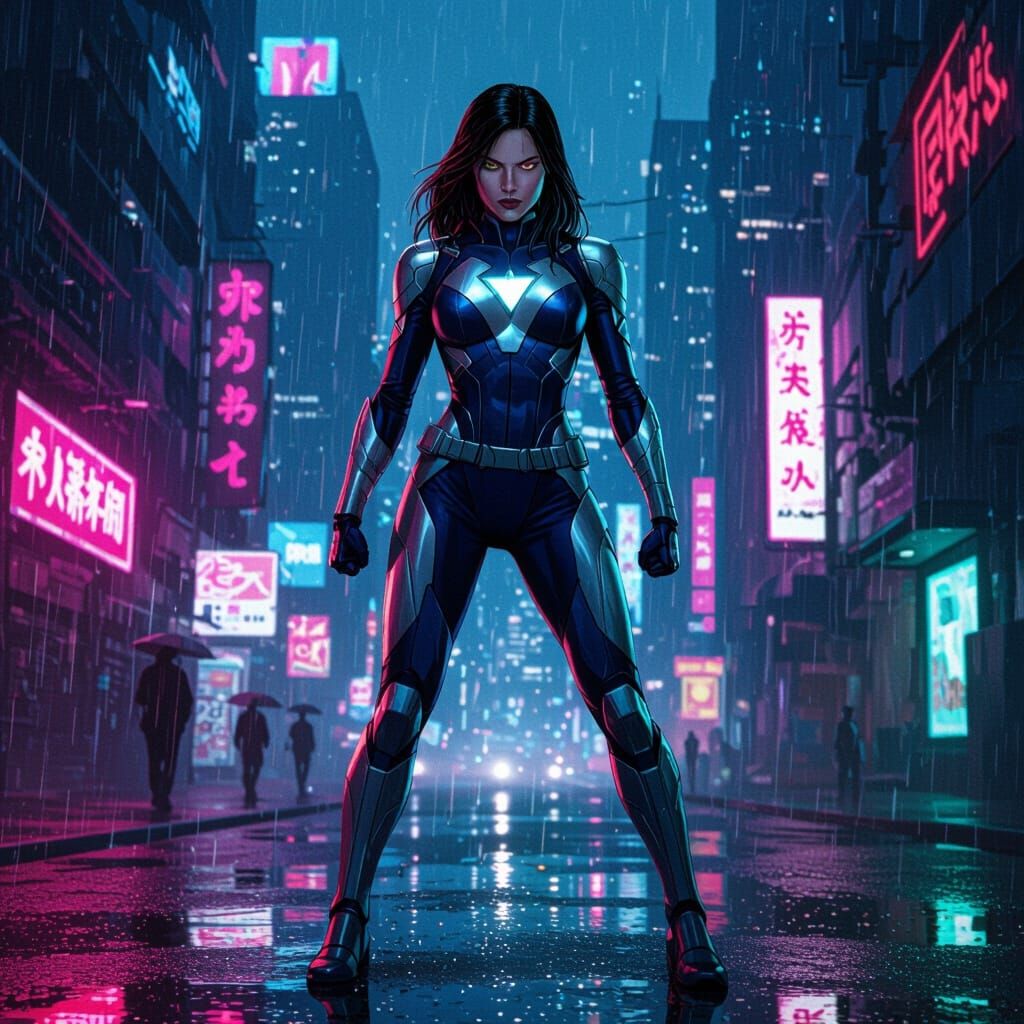 This image shows a powerful female superhero, "M," in a futuristic suit against a rainy, neon-lit cyberpunk cityscape. The art style blends comic book grit with sci-fi concept design, featuring dynamic lighting and vivid colors.