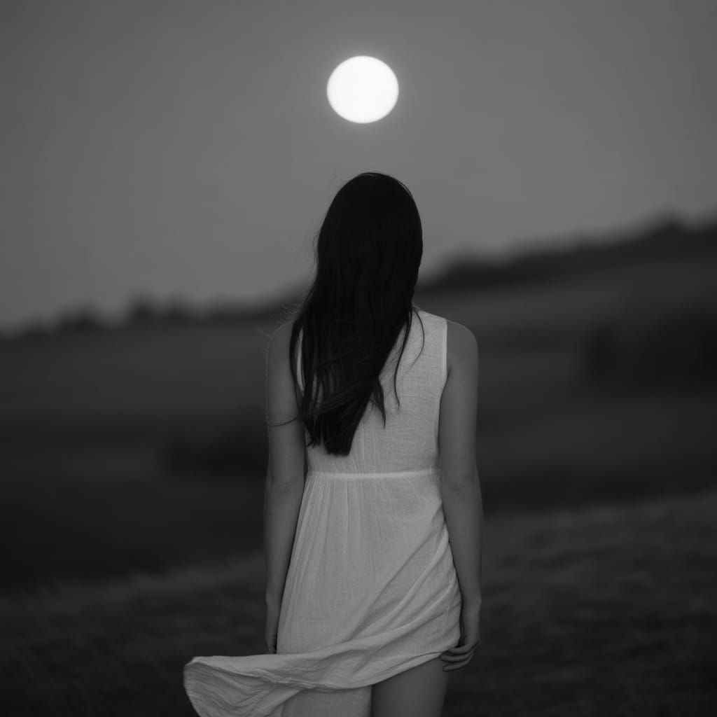 This image shows a woman in a white dress gazing at the full moon. The black and white photograph emphasizes dramatic lighting and a sense of solitude in a blurred landscape.