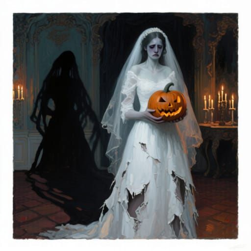 This image shows a hauntingly beautiful bride with a sad yet alluring expression, holding a jack-o'-lantern in a dimly lit Victorian ballroom. Rendered in a dramatic Symbolist style with thick brushstrokes and a dark palette.