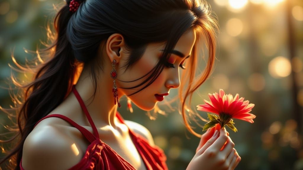 This image captures a petite Chinese woman in a red dress, gracefully smelling a flower. Shot with cinematic lighting and film grain, it evokes an epic, realistic quality.