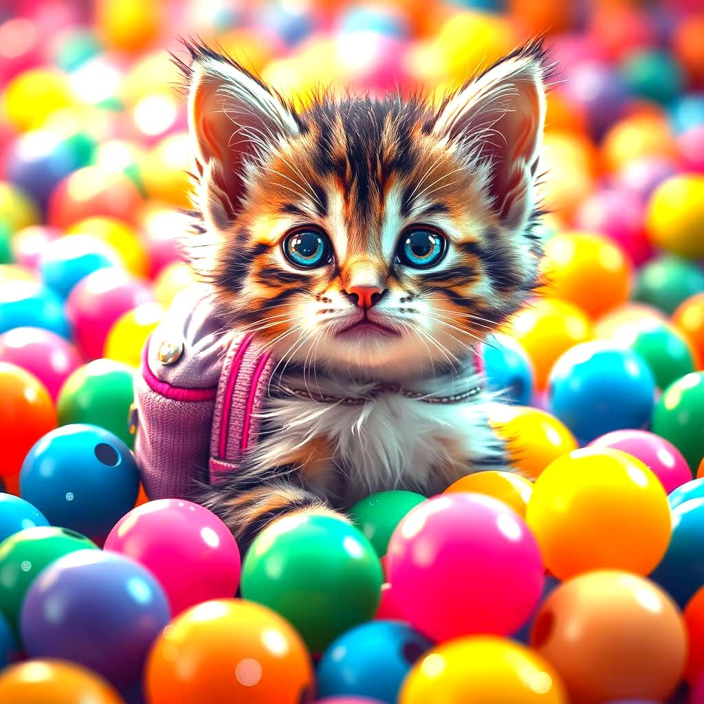 This stunning image depicts a kitten amidst a fantastical ball pit, crafted with intricate detail and rich, deep colors in a captivating fantasy art style.