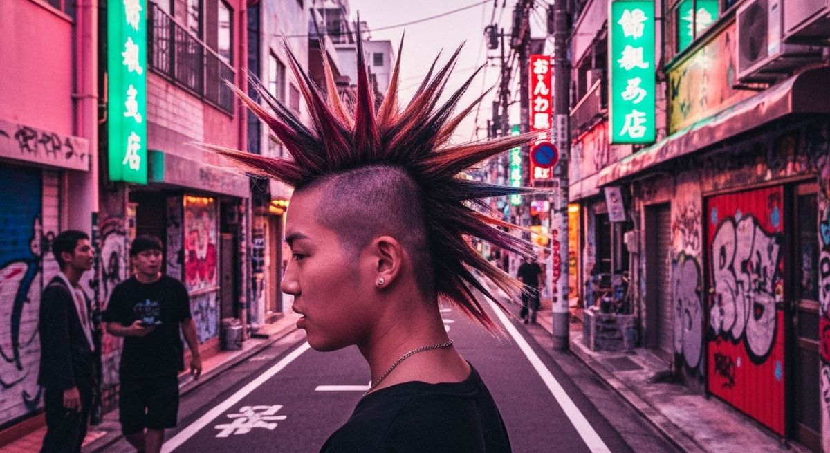 This image shows a gyaru-inspired girl with spiked, colorful hair in a vibrant Okinawa street scene. The backdrop features graffiti art and bright neon lights, capturing a cyberpunk aesthetic.