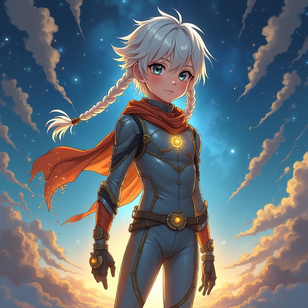 This image shows a young anime pilot standing in a swirling vortex of solar flares and starscapes, surrounded by swirling time cracks and a flowing scarf of light particles. In a dreamy spacepunk style, with deep indigo and bronze gold hues, he embodies a sense of dynamic movement and otherworldly wonder...