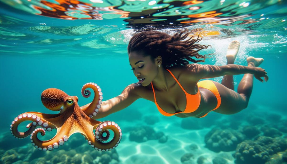 This image shows a slender young woman diving underwater in an orange bikini, playing with an octopus. This close-up color portrait uses vibrant hues and sharp focus to capture the intimate scene.