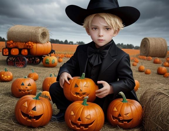 This image depicts a garish Halloween harvest festival with a child. Overly saturated colors and eerie lighting create an unsettling atmosphere, set among pumpkins and hay bales.