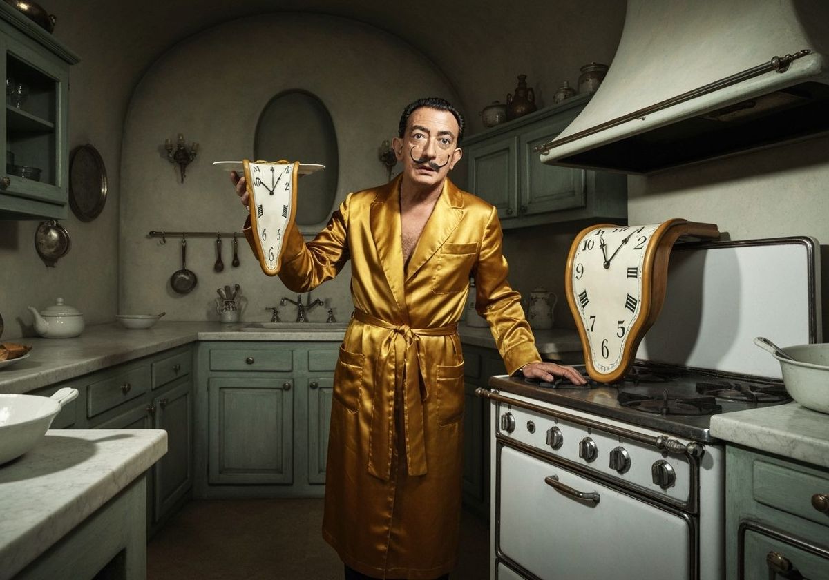 In a surreal kitchen, Salvador Dalí—draped in a gold robe—stands at a vintage stove, holding a melting clock like a fried egg. Dramatic lighting frame the dreamlike scene, a soft clock sculpture adorns the stove, blending culinary whimsy with surrealist exploration of time and reality. The medium shot captures Dalí and his bizarre creation in vivid, distorted detail.