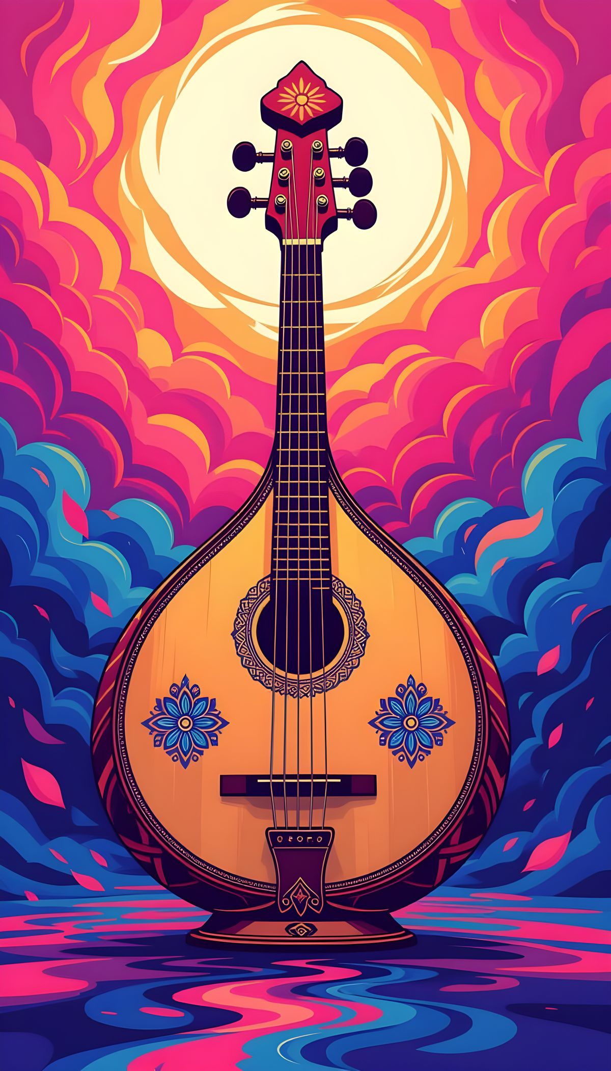 A digitally rendered image of an intricately decorated tanpura, a traditional Indian stringed instrument, set against a swirling, colorful background. The artwork has a vibrant, dynamic feel.