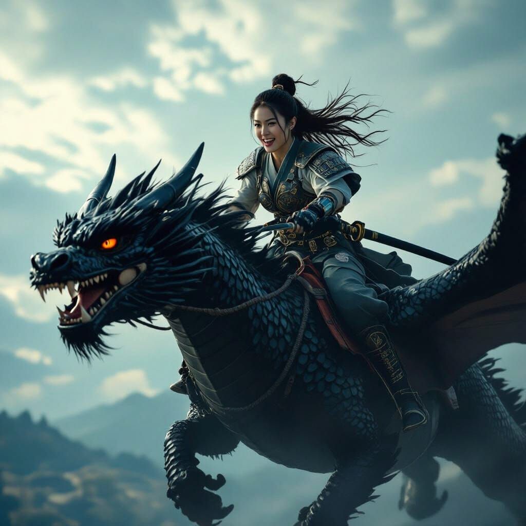Cinematic film still of a joyful Japanese woman riding a black dragon, sword in hand. Features dramatic lighting, rich film grain, and professional color grading for epic grandeur.
