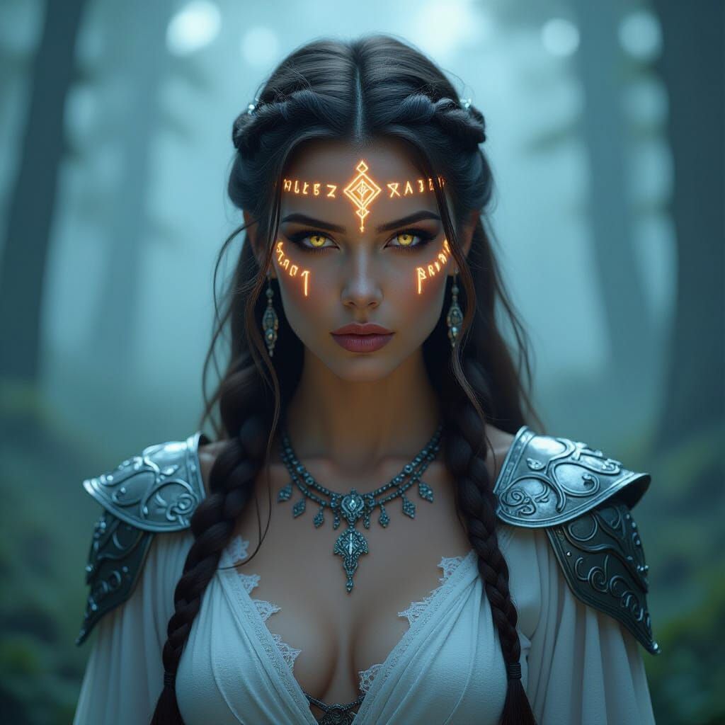 A captivating image of a Norse goddess amidst a misty forest. Her glowing runes and silver armor are rendered with soft, ethereal lighting and a dramatic, cinematic atmosphere.