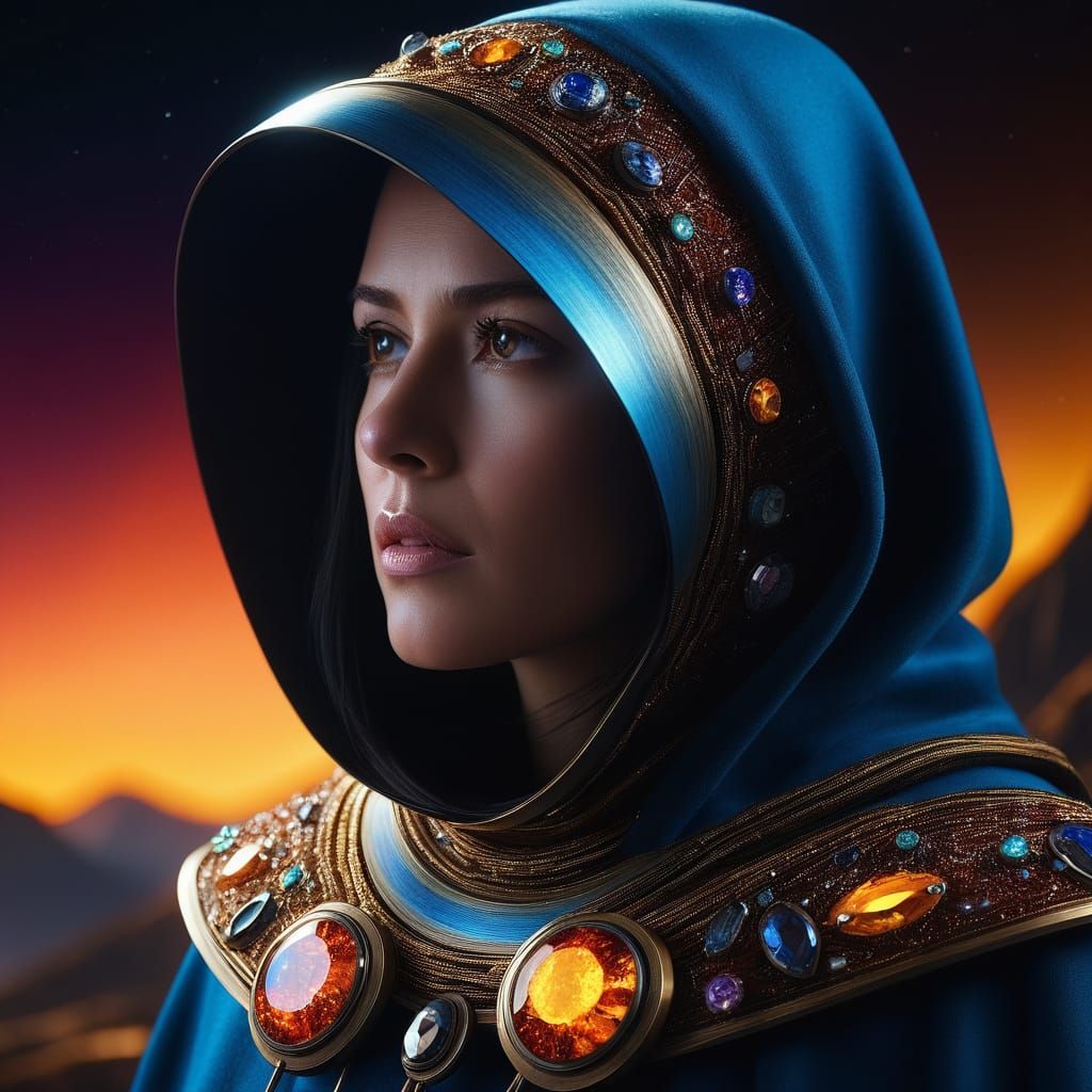 A striking picture of a person with cloisonnรฉ enamel and gemstone metal neck rings, wearing a woolen cloak and holding a glowing meteorite. This vibrant digital art piece uses triadic colors.