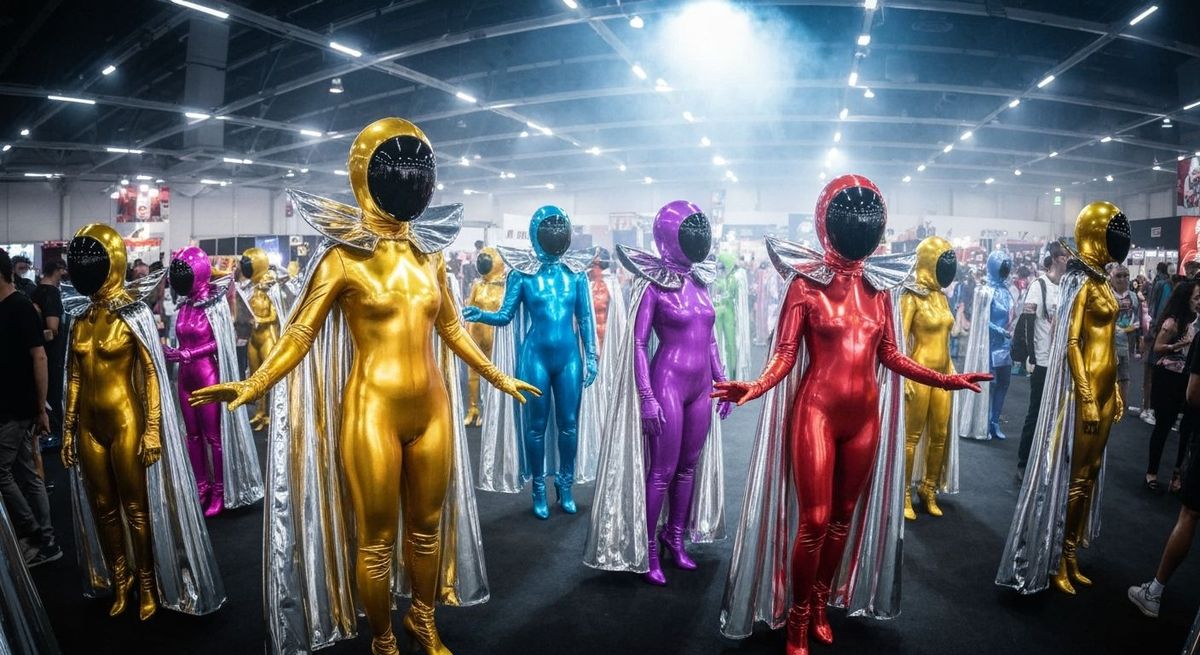 A wide-angle view of a vibrant convention with attendees in dazzling gold and colorful chrome rubber suits, capes, and helmets. Cinematic lighting and volumetric fog create a futuristic spectacle.