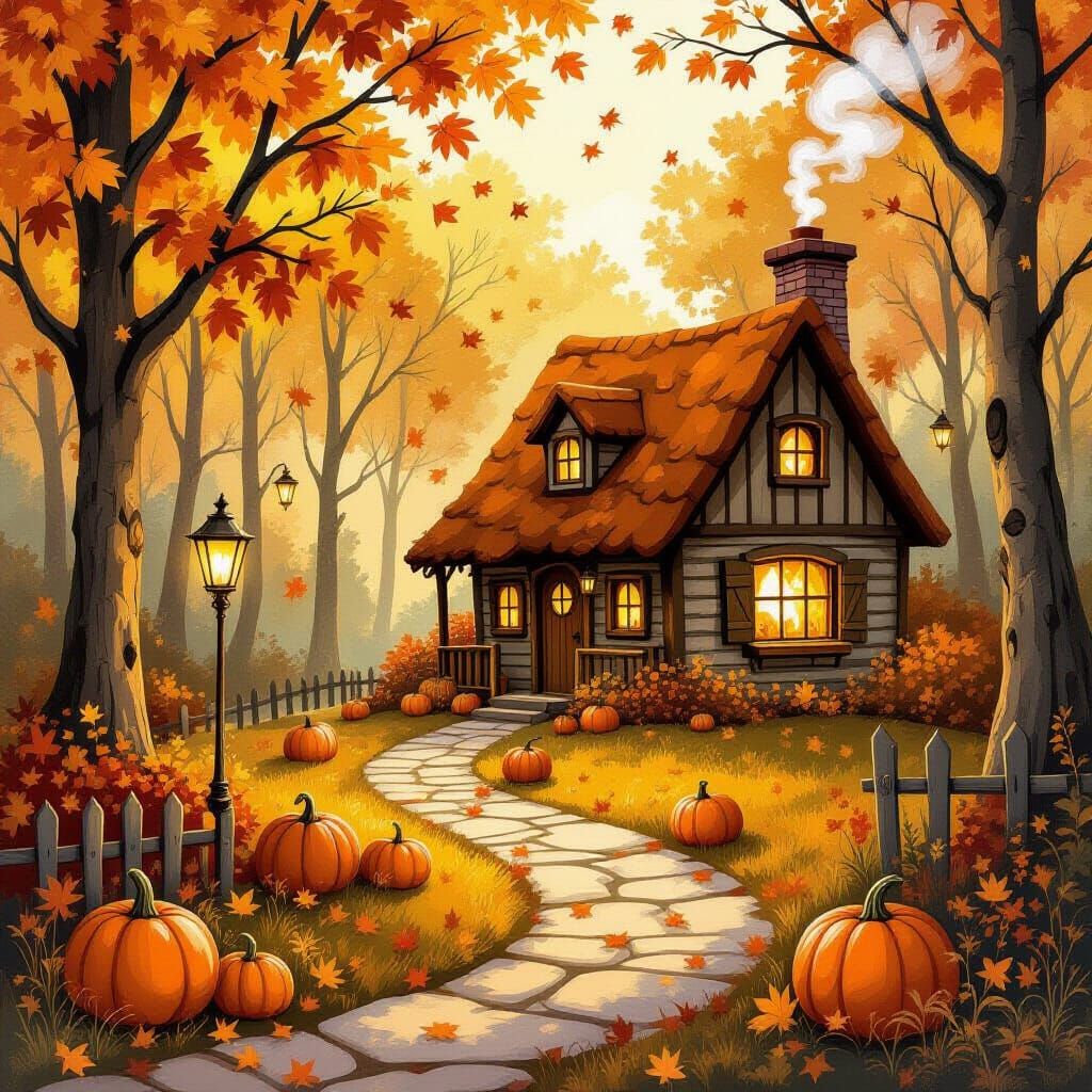 This image shows a charming rustic cottage in golden woods, adorned with pumpkins and fairy lights. Rendered as a detailed gouache painting with warm, soft tones, it evokes a whimsical storybook feel.