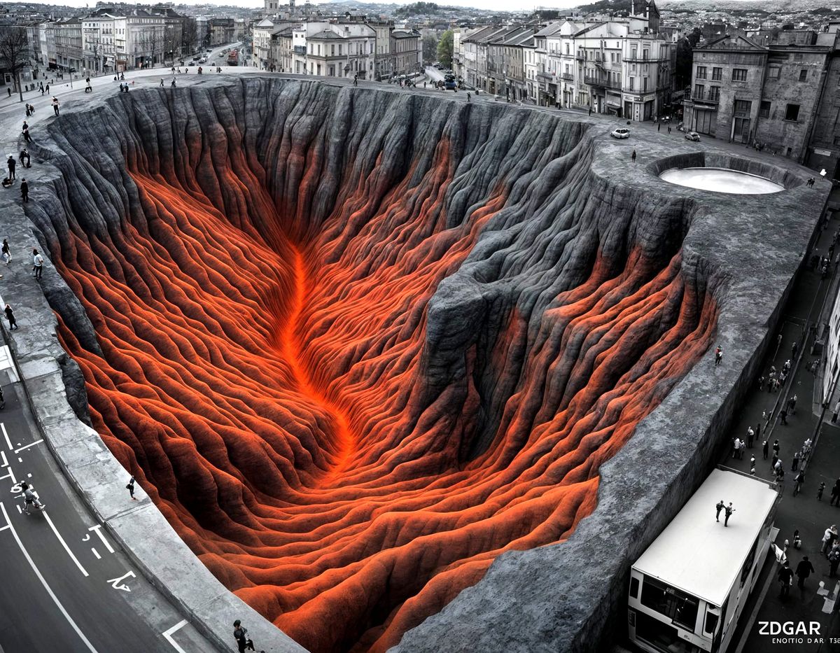 This image is a photorealistic depiction of a massive lava ravine, captured in intricate detail with a sense of scale and depth, as if seen through a high-end lens like the Carl Zeiss Apo Sonnar T* 2/135 ZE.