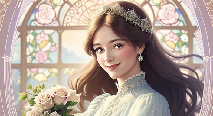 This image shows a woman with a gentle smile and sparkling eyes, holding a rose. Dressed in a fairytale gown, bathed in warm sunlight, rendered in an Art Nouveau style with delicate linework and pastel colors.