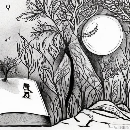 This image shows an ink drawing of floral and leaf patterns in a monochromatic storybook illustration style. The intricate details evoke a sense of classic elegance.
