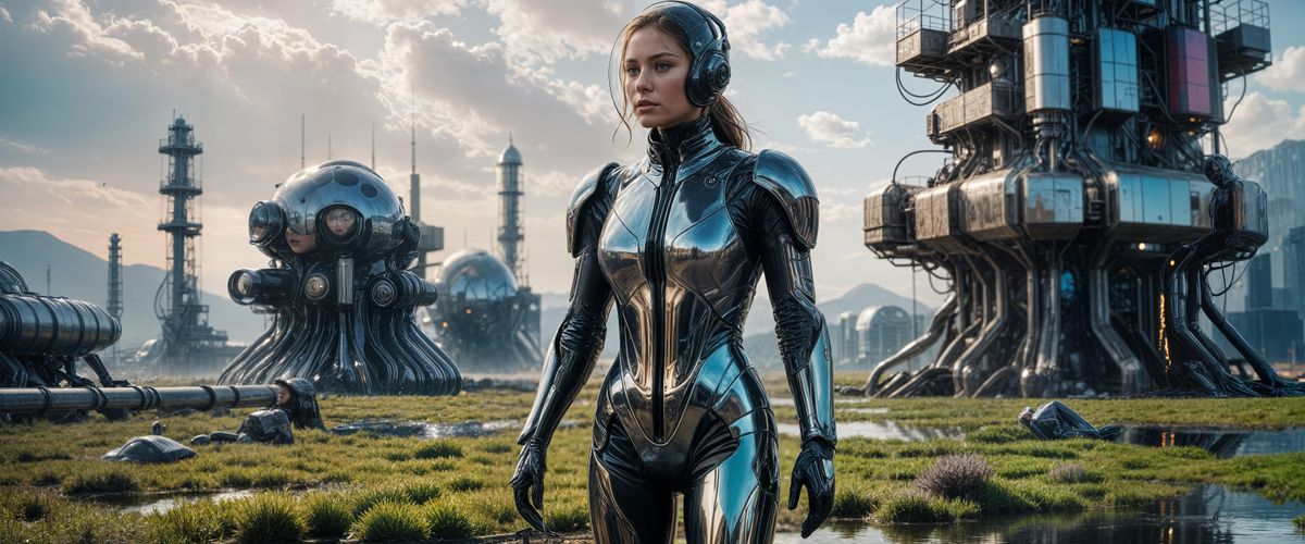 A stunning digital image of a woman wearing a sleek, futuristic liquid suit, exuding an otherworldly beauty and elegance.