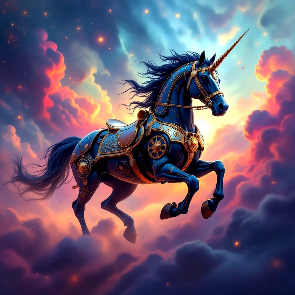 A majestic clockwork horse with visible gears gallops through a vibrant, swirling nebula. This image blends steampunk design with ethereal fantasy art, featuring cinematic lighting.