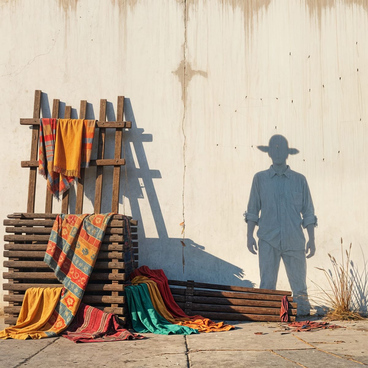 This image shows burnished steel bars resting on wooden staves, with colorful cloths fluttering in the breeze. In the distance, the shadow of a man appears on a blank wall.