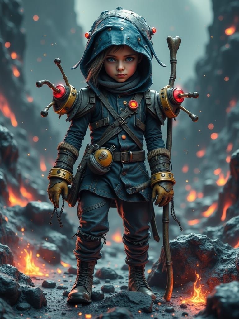 This image shows a handsome young figure amidst a fiery volcanic landscape, cultivating lava with industrial precision, amidst a blend of mystical and dystopian elements, reminiscent of Syd Mead's industrial vision and Zdzisław Beksiński's surreal atmosphere, with vibrant colors and intricate details.