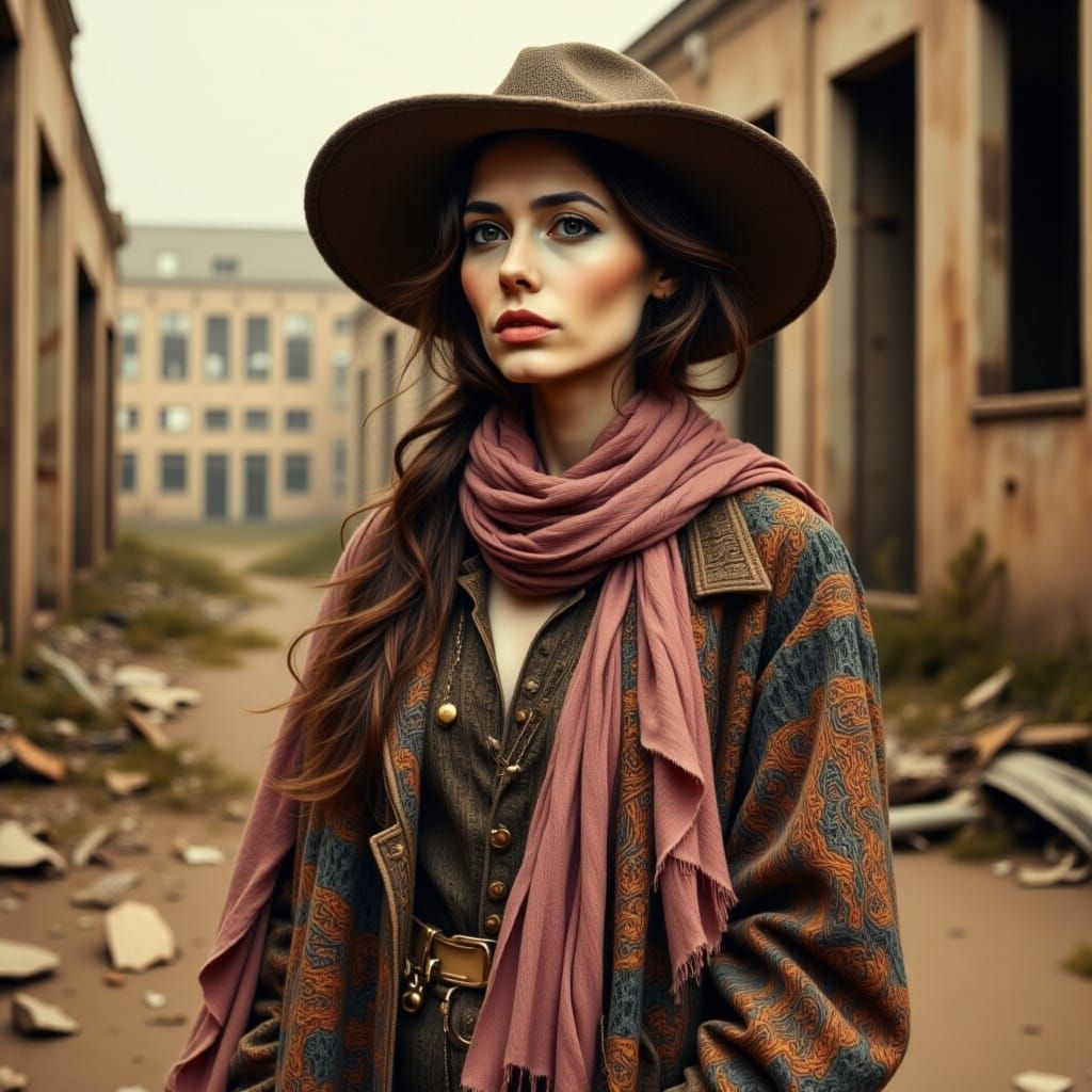 This image depicts a woman with a windswept, ornate brown robe and a pink scarf, set against a backdrop of a crumbling desert landscape with overgrown ruins, evoking a sense of mysticism and Art Nouveau flair.
