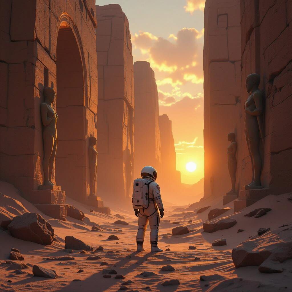 This hyperrealistic image shows an astronaut in a white suit exploring vast sandstone ruins on an alien planet. Ethereal crimson and gold light from a binary sunset illuminates the mysterious, ancient landscape.
